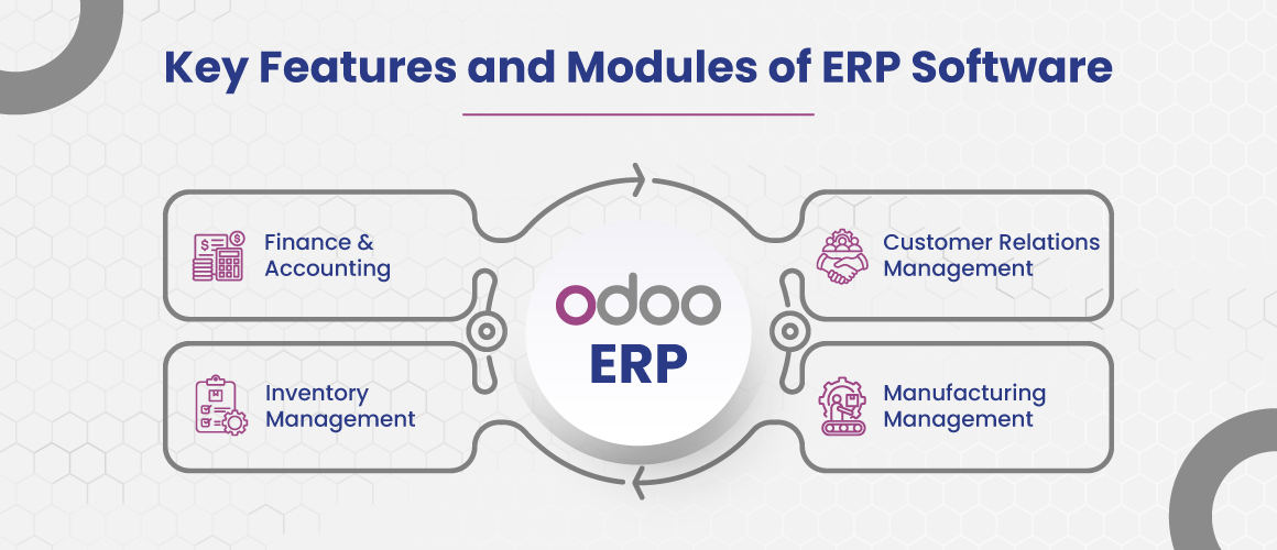 An ERP software has a modular structure, and each component acts as a feature to manage a particular business function in a centralized database. Here is a glimpse of the core features and modules of ERP solutions